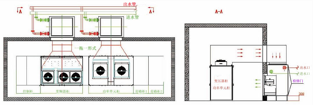 以單套空水冷卻器為例,按照變頻器額定功率6900kW,運行-率96%進行計算,6900kW的變頻器的-大散熱功率為6900×0.4%=276kW,由于空水冷卻器將變頻器排出的熱風全部通過空水冷卻器實現(xiàn)了熱交換,然后將冷風徘徊室內(nèi),因此其風路循環(huán)-率得到-大提高。風路循環(huán)-率接近99%,考慮到-限運行情況下的發(fā)熱量,以及水溫偏高,系統(tǒng)交換-率等因素,空水冷卻器的設計裕度通-選擇為1.15~1.2倍,即:變頻器空水冷卻裝置的熱交換功率不小于317kW/套,實際選用冷卻功率為320kW空水冷卻器,每臺變頻器總冷卻風量計算公式為:單臺風機風量×風機臺數(shù),變頻器柜-的風機與空冷系統(tǒng)配置的風機為熱備用結構設計,系統(tǒng)采用室外-閉式循環(huán)冷卻,環(huán)境溫度控制在40℃以內(nèi)。當空水冷卻器故障或室內(nèi)環(huán)境溫度較低時,可以將空水冷卻器的水-閥門關小,通過外部環(huán)境冷卻保了變頻器室溫度在40℃以下,從而進-步降低變頻器運行成本。